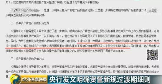 《通知》进一步明确,过渡期内,金融机构可以适当发行一部分老产品投资一些新资产,但这些新资产应当优先满足国家重点领域和重大工程建设续建项目以及中小微企业的融资需求。