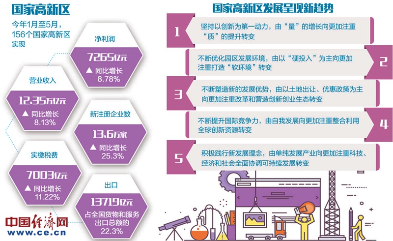 目前我国共有168家国家级高新区,其中12家是今年新批准的,可以与去年数据相对比的是156家。据统计,今年1月至5月,156个国家高新区共实现营业收入12.35万亿元,同比增长8.13%;新注册企业数13.6万家,同比增长25.3%;出口13719亿元,占全国货物和服务出口总额的22.3%。