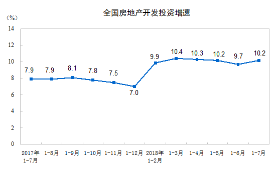 2018年1-7月份,全国房地产开发投资65886亿元,同比增长10.2%,增速比1-6月份提高0.5个百分点。其中,住宅投资46443亿元,增长14.2%,增速提高0.6个百分点。住宅投资占房地产开发投资的比重为70.5%。