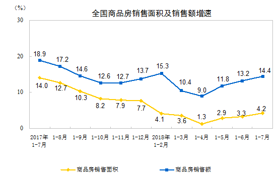 1-7月份,商品房销售面积89990万平方米,同比增长4.2%,增速比1-6月份提高0.9个百分点。其中,住宅销售面积增长4.2%,办公楼销售面积下降5.8%,商业营业用房销售面积增长2.3%。商品房销售额78300亿元,增长14.4%,增速提高1.2个百分点。其中,住宅销售额增长16.2%,办公楼销售额下降2.1%,商业营业用房销售额增长5.5%。