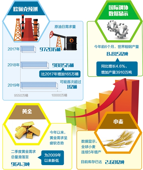 今年以来,受世界经济复苏、贸易摩擦升级及地缘政治等因素影响,全球主要大宗商品市场在整体升温的同时,市场结构有所分化。石油等能源类大宗商品价格继去年大幅跃升28%之后,今年继续显著攀升;金属价格整体降温,黑金属和有色金属价格继续分化;农产品价格则保持相对平稳,呈小幅上扬态势。展望下半年,全球大宗商品整体价格将继续保持温和上涨,但不同产品分化依旧。世界银行代理首席经济学家尚塔亚南·德瓦拉扬表示:“全球经济增长加快和需求上升是推动大部分大宗商品涨价和未来大宗商品价格看涨预期的重要因素。”