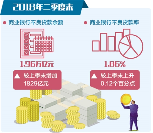 8月13日,中国银行保险监督管理委员会发布的2018年二季度银行业主要监管指标数据显示,2018年二季度末,商业银行不良贷款余额1.96万亿元,较上季末增加1829亿元;商业银行不良贷款率1.86%,较上季末上升0.12个百分点。