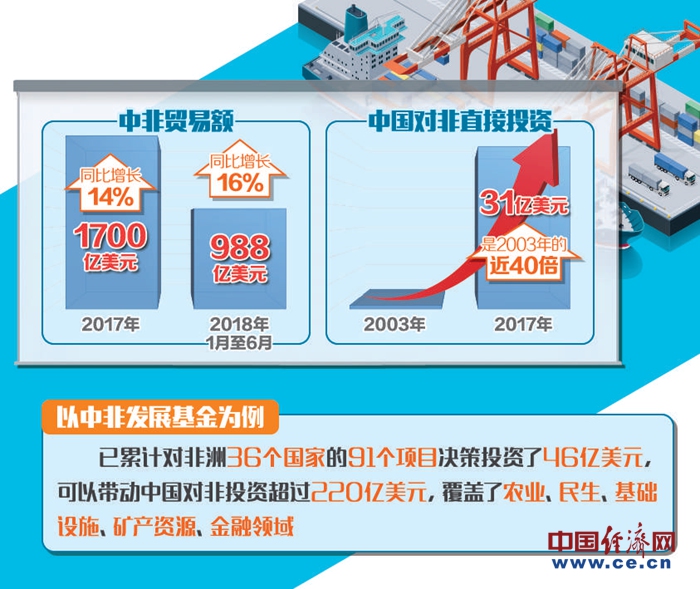 数据显示,2017年,中非贸易额达1700亿美元,同比增长14%。今年1月份至6月份,中非贸易额达988亿美元,同比增长16%。中国近3年对非洲年均直接投资保持在30亿美元左右。中非双方加强产业对接,不少重点投资项目取得积极进展,在制造业、金融、旅游、航空等领域的合作也取得新突破。