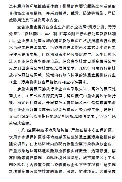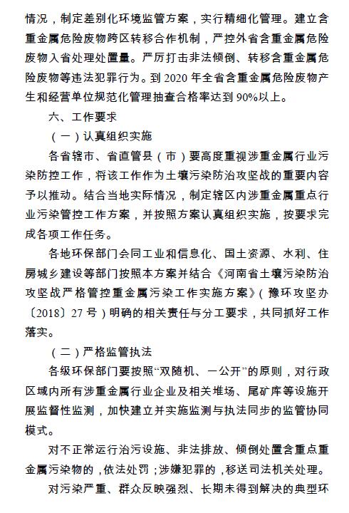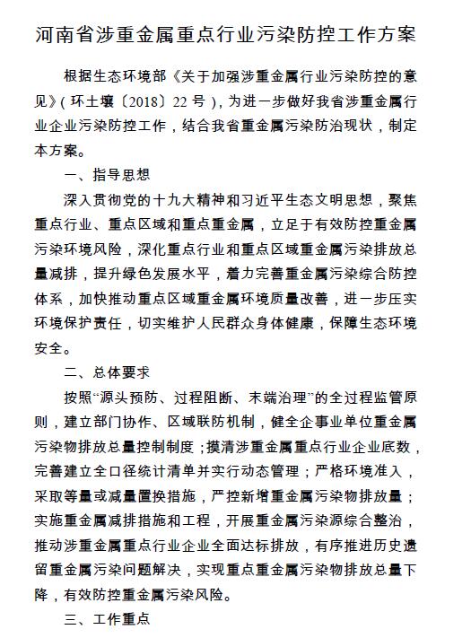 河南省环境保护厅关于印发河南省涉重金属重点行业污染防控工作方案的通知各省辖市、省直管县(市)环保局,郑州航空港经济综合实验区市政建设环保局:根据生态环境部《关于加强涉重金属行业污染防控的意见》(环土壤﹝2018﹞22号),结合我省重金属污染防治现状,我省制定了《河南省涉重金属重点行业污染防控工作方案》(详见附件),现印发给你们,请按照方案认真执行。2018年10月8日主办:土壤办督办:土壤办河南省环境保护厅办公室 2018年10月8日印发