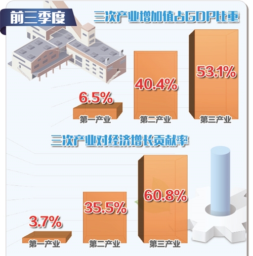 从三次产业构成看,第三产业比重不断提高。前三季度,三次产业增加值占GDP的比重分别为6.5%、40.4%和53.1%,三次产业对经济增长贡献率分别为3.7%、35.5%和60.8%。