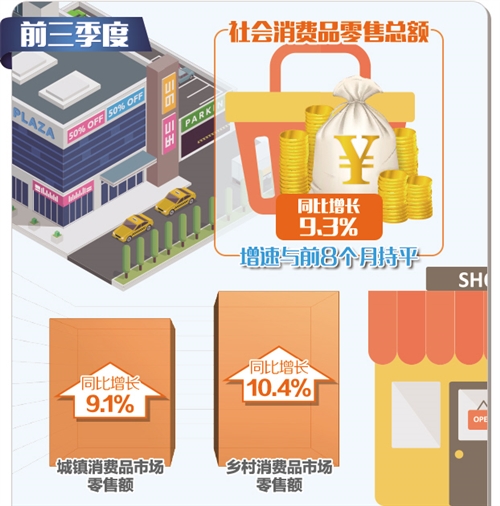 市场销售增速平稳。前三季度,社会消费品零售总额同比增长9.3%,增速与前8个月持平。消费继续稳居经济增长的第一驱动力。