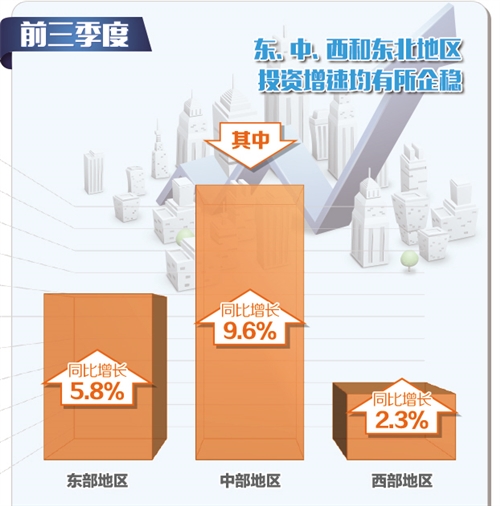 前三季度,东、中、西和东北地区投资增速均有所企稳。其中,东部地区投资同比增长5.8%,增速比前8个月提高0.1个百分点;中部地区投资增长9.6%,增速提高0.4个百分点;西部地区投资增长2.3%,增速提高0.1个百分点;东北地区投资增长1.7%,增速与前8个月持平。