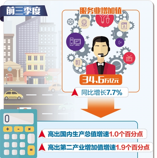 服务业重要地位持续提升。前三季度,服务业固定资产投资同比增长5.3%,增速比第二产业高0.1个百分点。