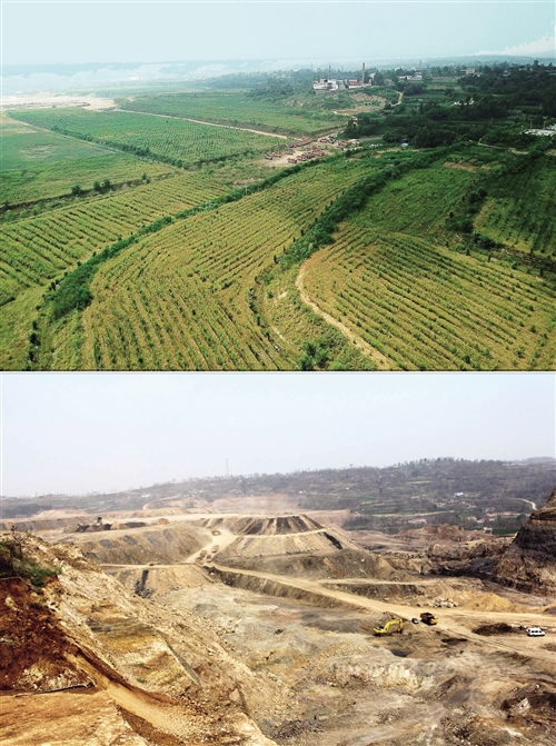 上图:修复治理后的河南省新安县北冶镇马行沟矿区(8月29日无人机拍摄);下图:修复治理前的马行沟矿区(资料照片)。