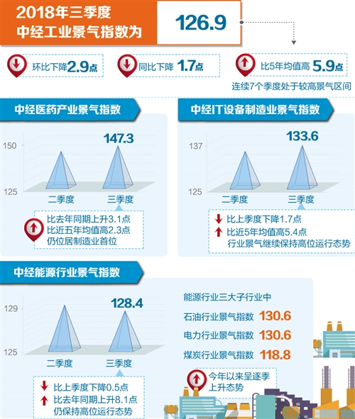 由经济日报社中国经济趋势研究院、国家统计局中国经济景气监测中心、中国社科院数量经济与技术经济研究所共同编制的2018年三季度中经产业景气指数今日发布。本季度中经产业景气指数所采集的具有代表性行业和领域共14个,包括煤炭、石油、电力、钢铁、有色金属、非金属矿物制品、化工、汽车制造、IT设备制造、医药、服装11个具体行业,同时涵盖能源、材料和工业3个综合性领域——