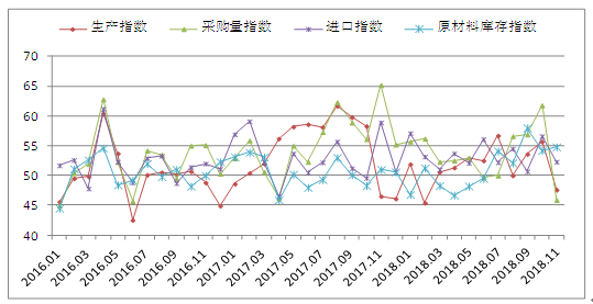 图2 2016年以来生产指数、采购量指数、进口指数和原材料库存指数变化情况