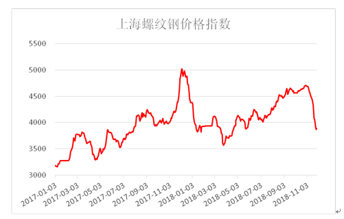 11月份,国内钢材价格大幅下跌。卓钢链数据显示,11月1日,上海螺纹钢指数为4691元/吨,到11月28日,上海螺纹钢指数跌至3884元/吨,单月下跌超过17%。11月国内钢材价格全线大跌。主要原因有以下几点,一是冬季来临,北方工地陆续停工,加上前一个月下游行业备货充足,钢铁需求有所下降;二是限产力度减弱,预期生产缩减有限,加上北材南下,使得南方地区出现供大于求的情况。