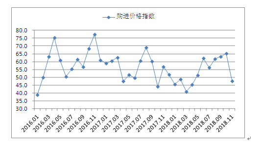 本月国内原材料市场价格大幅下跌,钢坯、废钢、焦炭,铁精粉均有不同程度价格下跌。原材料购进价格指数结束了连续三个月的环比上升,本月降至47.6%,降幅达17.6个百分点。截止到11月28日,唐山地区普碳方坯出厂价格为3040元/吨,较上月末下降940元/吨;上海地区废钢价格为2140元/吨,较上月末下降340元/吨;河南地区二级焦炭价格为2320元/吨,较上月末下降100元/吨;唐山地区65-66品味干基铁精粉价格为720元/吨,较上月末下降45元/吨。截止11月27日,普氏62%铁矿石指数为64.75美元/吨,较上月同期下降12.25美元/吨。