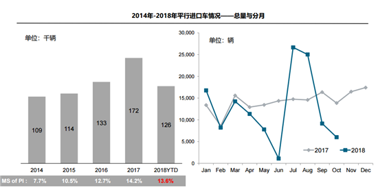 值得一提的是,平行进口也未能逃过一劫,进口量惨遭腰斩。10月,平行进口汽车量仅为0.6万辆,同比下滑56.6%;1-10月,平行进口累计达12.6万辆,同比下降8.3%,占进口总量的13.6%,相比2017全年的14.2%下降0.6个百分点。