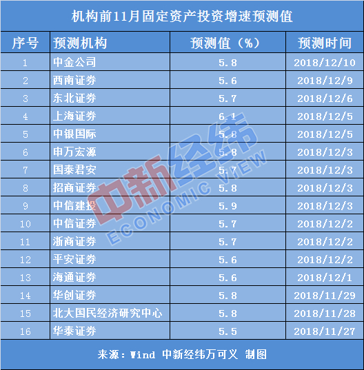 投资数据方面,中新经纬客户端发现,国泰君安、华创证券等16家机构对1-11月份固定资产投资(不含农户)增速平均预测值为5.7%,预测最大值为6.1%,最小值5.5%。