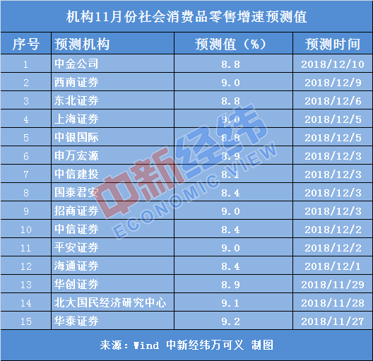 根据Wind统计,15家机构对11月份社会消费品零售增速平均预测值为8.8%,预测最大值为9.2%,最小值8.1%。