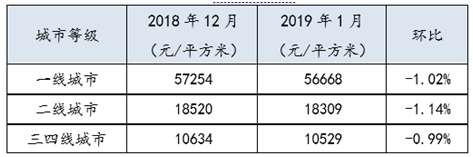 从2019年1月份100个城市二手住宅挂牌均价情况来看,市场分化现象更加明显,环比上涨城市数量增多,下跌城市数量减少,但平均跌幅扩大。单价1万元以下城市增加3个,调控下市场房价得到有效控制,部分涨幅较大城市回调趋势明显。一线、二线及东部发达城市进入2019年后依旧保持调控高压,市场下行。部分三四线城市市场变化明显,下跌幅度较大。 |