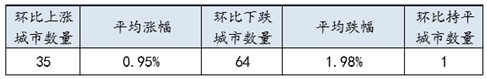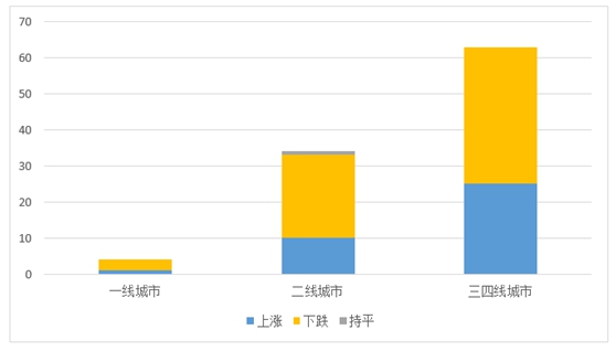 分城市来看,一线城市中1个上涨,3个下跌;二线及三四线内城市中下跌城市数量占比超6成。