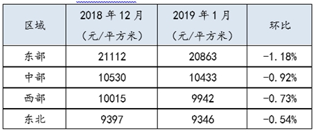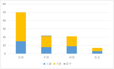 从环比情况来看,各区域全线下跌。东部、中部市场继续下行,跌幅在1%左右,其中东部地区虽然跌幅有所收窄,但仍然下跌最大,下跌1.18%,东北地区跌幅较小,仅下跌0.54%。