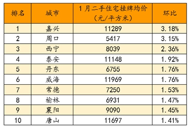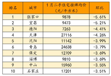 2019年1月100城二手住宅挂牌价格涨跌城市