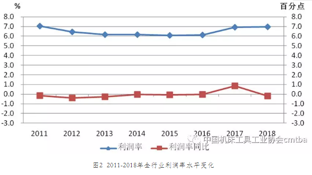 机床工具行业规上企业2018年实现利润总额499.2亿元,同比增长5.3%。其中,金属切削机床行业实现利润总额46.7亿元,同比降低24.8%。金属成形机床行业实现利润总额58.2亿元,同比增长0.3%。工量具及量仪行业实现利润总额91.0亿元,同比增长9.4%。2018年机床工具行业规上企业利润率为7.0%,较上年同期降低0.2个百分点。2011-2018年全行业利润率水平及其同比变化见图2。