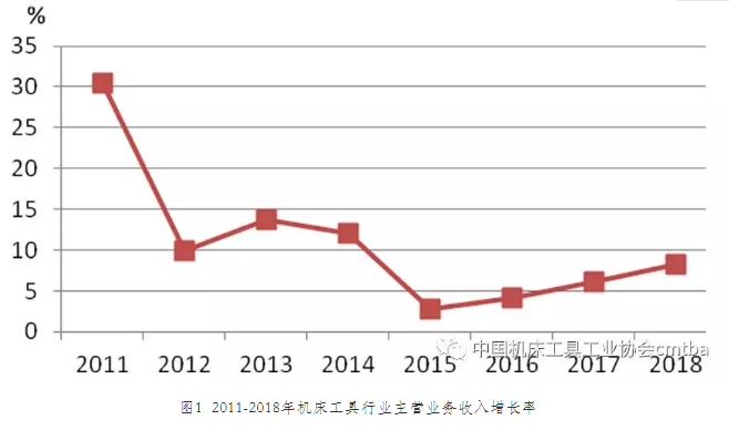 2018年机床工具行业规上企业主营业务收入7151.3亿元,同比增长8.3%。其中,金属切削机床行业完成主营业务收入1190.1亿元,同比增长3.3%。金属成形机床行业完成主营业务收入758.6亿元,同比增长10.0%。工量具及量仪行业完成主营业务收入964.2亿元,同比增长9.6%。2011-2018年机床工具行业主营业务收入增长率情况见图1。