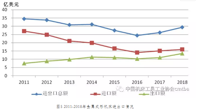 2018年金属加工机床进口总额96.7亿美元,同比增长10.6%。其中,金属切削机床80.7亿美元,同比增长11.7%,达到了2015年以来的年度最高值;金属成形机床15.9亿美元,同比增长5.6%,也达到了2016年以来的年度最高值。从增速看,金属切削机床进口的增长快于金属成形机床进口的增长。2011-2018年金属切削机床和金属成形机床进出口情况分别见图4、图5。