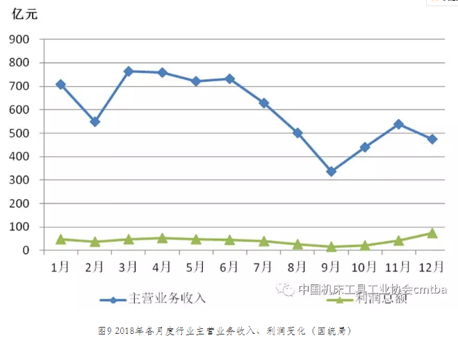 从图9可以看出,2018年上半年我国机床工具行业延续了上年恢复性增长趋势,各月主营业务收入和利润总额累计值均同比两位数增长,各月完成额也较均衡。但7月份之后出现了快速的下滑,不过下滑趋势在9月止底后已开始缓慢修复。