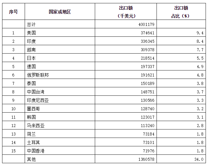 由上表可见,按金额计算金属加工机床出口去向前3位的国家和地区是美国(9.4%)、印度(8.4%)和越南(7.7%),三者合计约占25%。