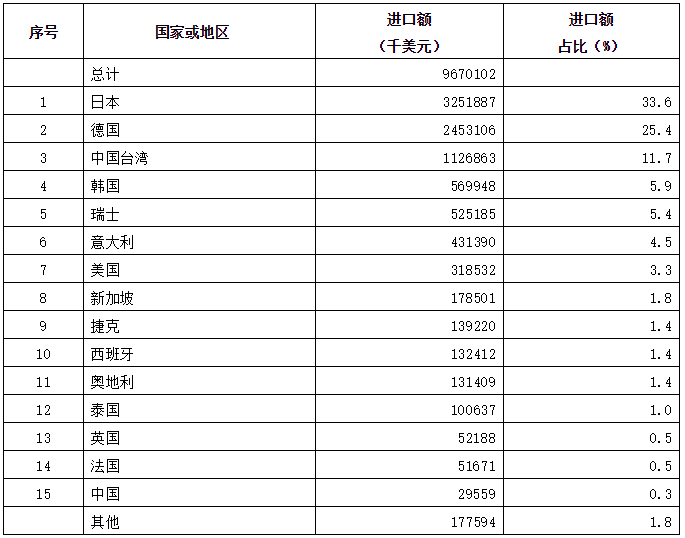 由上表数据可见,按金额计算金属加工机床进口来源前3位的国家和地区是日本(33.6%)、德国(25.4%)和中国台湾(11.7%),三者合计超过70%。