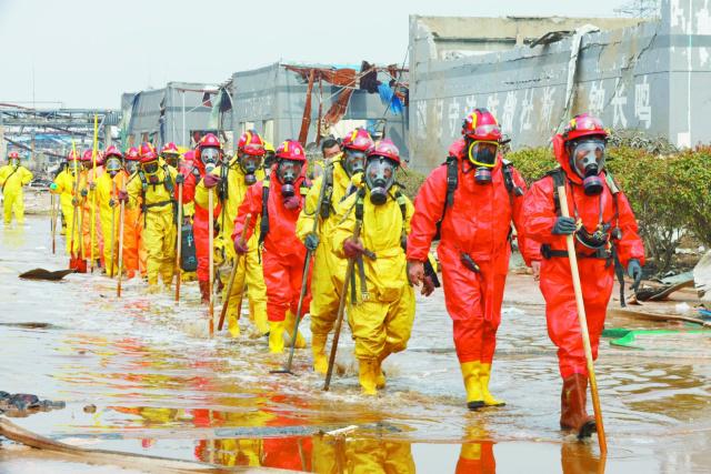 据陆军介绍,化工厂爆炸以后,消防人员携带各种侦检器材对现场进行检测。做好全套防护措施,严格遵守“不穿防护服不戴呼吸器坚决不准进入现场”。另外,针对不同的燃烧物质,救援人员有针对性地选用灭火泡沫,比如厂区内的3个储罐,两个苯罐加1个甲醇罐,每个1500立方,总共4500立方,甲醇燃烧必须用抗溶性泡沫扑救。我们架设了13台泡沫炮,对罐体进行冷却和扑救,让正在燃烧的罐体不至于坍塌,因为一旦坍塌,易燃液体流到地面形成流淌火,更加难以控制。同时我们确定了灭火和救人同步开展的策略。前期到现场的近280人的搜救队分成40个搜救组,每组5到7人,在1.1平方公里的范围内展开搜救,共涉及16家企业和一个污水处理站,第一时间进入每个办公区和车间进行搜救。此外,东部战区总医院医疗队也会到现场对消防员进行心理干预。