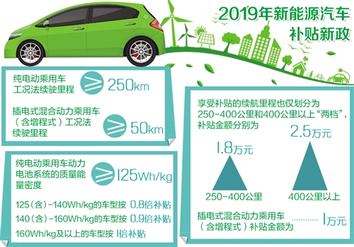 2019年新政提出:纯电动乘用车工况法续驶里程不低于250公里,插电式混合动力乘用车(含增程式)工况法续驶里程不低于50公里,享受补贴的续航里程也仅划分为250至400公里和400公里以上“两档”,补贴金额分别为1.8万元和2.5万元,插电式混合动力乘用车(含增程式)补贴金额为1万元。