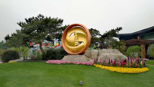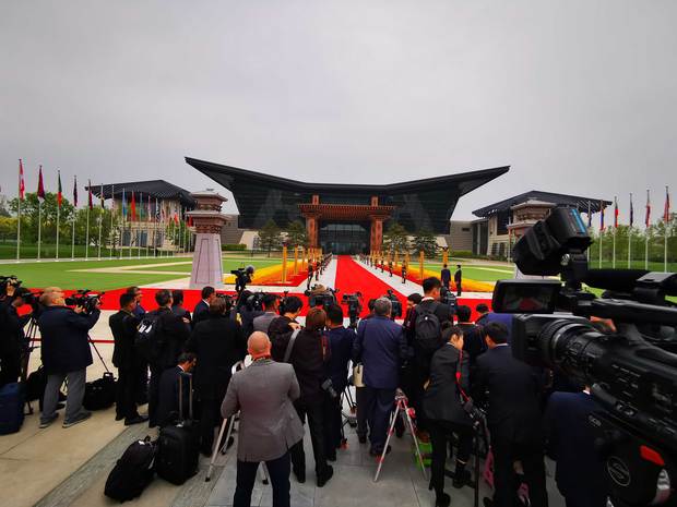 △会场外“一带一路”国际合作高峰论坛的会标。上半部分代表“丝绸之路经济带”,下半部分代表“21世纪海上丝绸之路”,中间的核心元素是陕西西安的大雁塔,寓意古丝绸之路始于西安、惠及全球。(央视记者曹亚星拍摄)