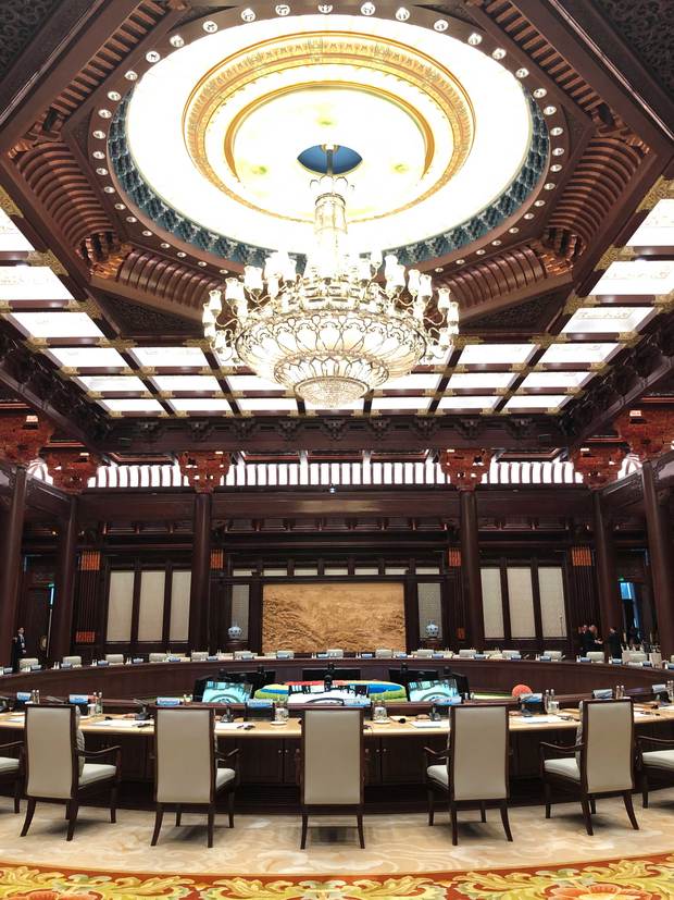 △习近平与外方领导人合影处。因为下雨,原定在室外进行的迎宾仪式和集体合影转移到了室内举行。(央视记者石伟明拍摄)