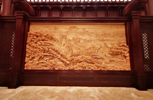 △集贤厅南墙东阳木雕《锦绣中华》,长13米、宽4.7米。由中国工艺美术大师陆光正创作。