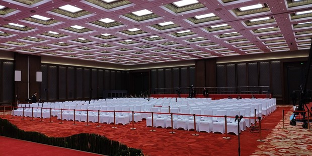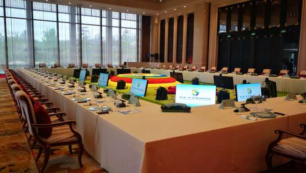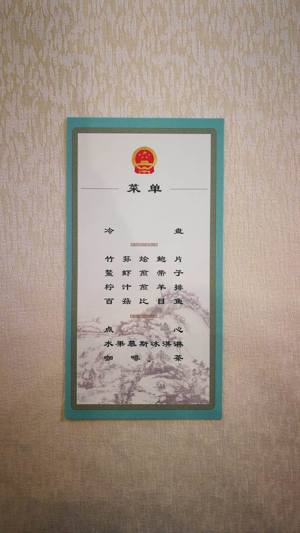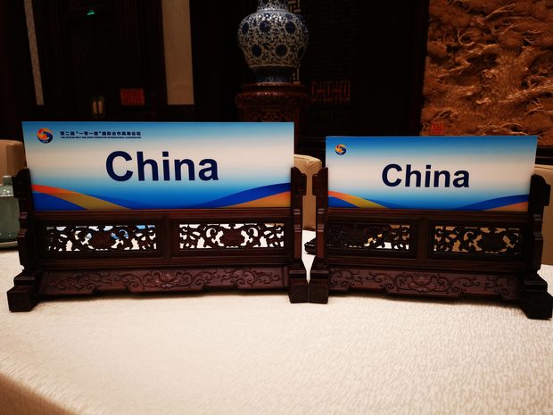 △圆桌峰会桌签的设计灵感来源于中式雕花屏风设计。为了让画面构图达到最佳效果,习主席桌上的桌签是精心挑选过尺寸的。这是在早前的论坛演练中《时政新闻眼》拍到的。(央视记者张晓鹏拍摄)