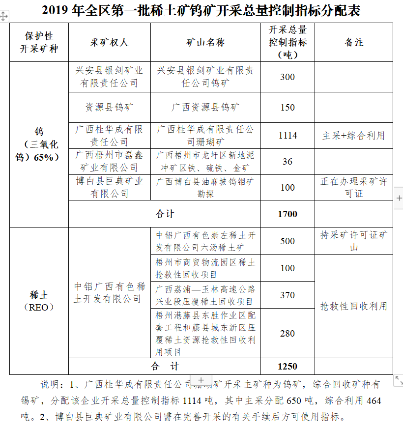 2019年全区第一批稀土矿钨矿开采总量控制指标分配表如下: