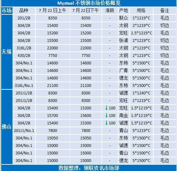 无锡:周五伦镍高位调整,转折下跌295,受此影响,早间无锡不锈钢市场不锈钢价格涨价叫停,贸易商多暂时平盘观望,并不轻易下跌,也有304热轧价格部分高价开始有下调100元/吨左右的操作,早上挺价的人还大有人在,但成交持续不畅,下午价格继续下探,目前304热轧走至14500-14600元/吨;而钢厂方面,却是各有操作,除430外统跌200元/吨!北海诚德再度封盘不报;其余钢厂多报平。