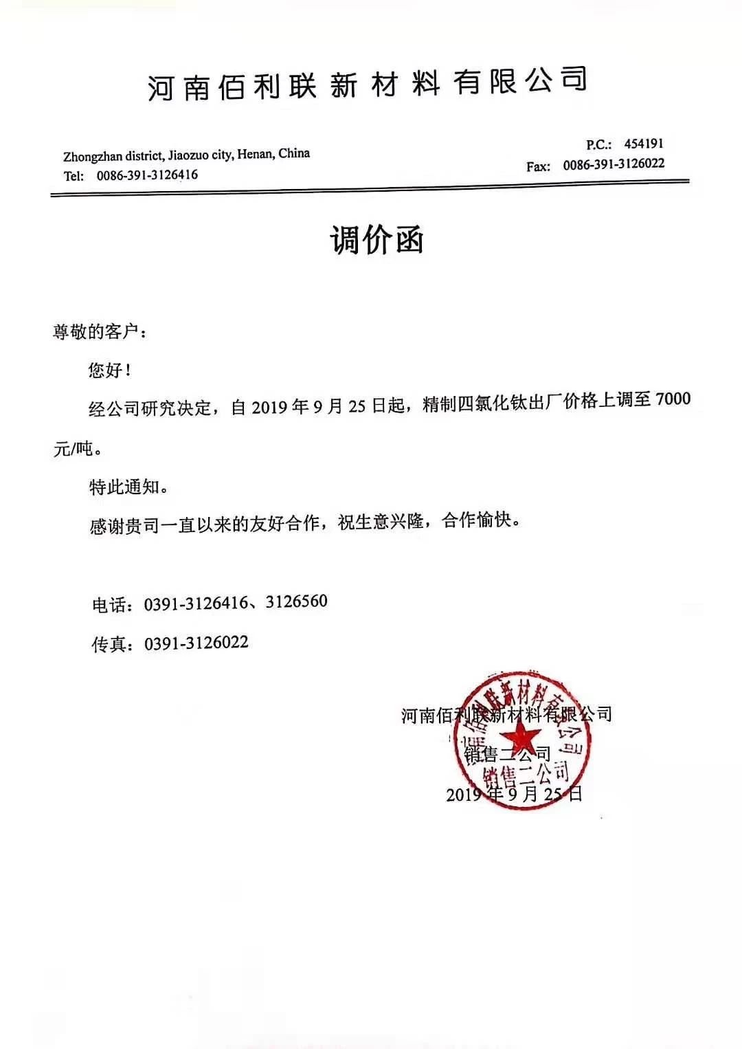 河南佰利联新材料有限公司发布精四氯化钛调价函