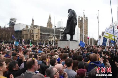 资料图:2019年3月,英国伦敦市中心,爆发大规模呼吁举行“第二次脱欧公投”的示威游行。