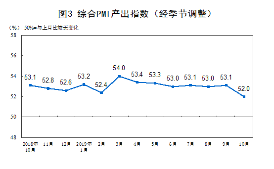 2019年10月份,综合PMI产出指数为52.0%,比上月回落1.1个百分点,表明我国企业生产经营活动总体延续扩张态势。
