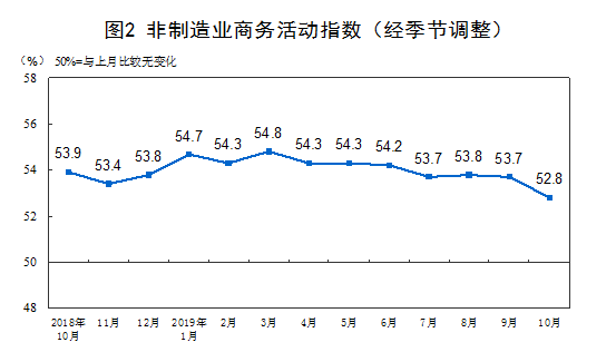 2019年10月份,非制造业商务活动指数为52.8%,比上月回落0.9个百分点,表明非制造业总体保持扩张态势,增速有所放缓。