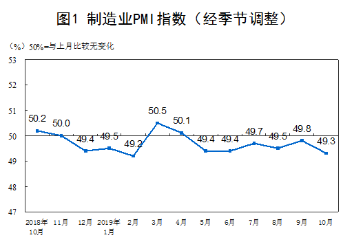 2019年10月份,中国制造业采购经理指数(PMI)为49.3%,比上月下降0.5个百分点。