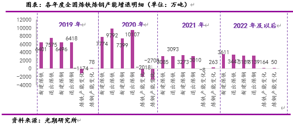 据统计,2020年全国新建炼铁产能7774万吨,新建炼钢产能7399万吨,退出炼铁产能9793万吨,退出炼钢产能10107万吨,净退出炼铁产能2019万吨,净退出炼钢产能2708万吨,其中新建的炼铁、炼钢产能中约有65%计划于2020年下半年陆续投产。