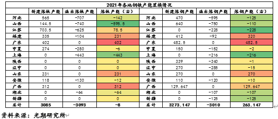 2021年全年新建炼铁产能3085万吨,新建炼钢产能3273万吨,退出炼铁产能3093万吨,退出炼钢产能3010万吨,净退出炼铁产能8万吨,净增加炼钢产能263万吨。