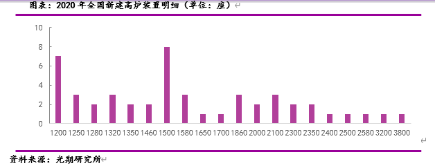 综合来看,新建的高炉容积主要在1200-2000m³,占全部投产比例的80%左右,其具体分布如下: