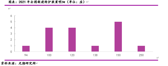 2021年拟新建转炉装置17座,转炉容量从94吨到350吨不等,炼钢产能达到2791万吨,新建150吨转炉装置最多,达5座,其次是100吨和120吨转炉,各有4座,这三种规模的转炉占总投产转炉数量的80%以上,具体投产装置明细如下: