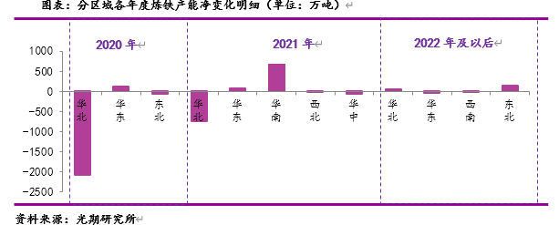 分区域来看, 炼铁产能净变化方面,据统计2020年华北是主要炼铁产能退出地区,华东地区有部分炼铁产能增加;2021年华北仍是炼铁产能退出地区,而华南则有大量新增炼铁产能;2022年及以后,华东、西南成为炼铁产能退出主要地区,而东北、华北则有部分炼铁产能新增计划。