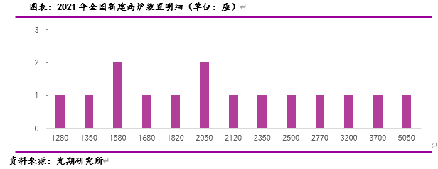 具体投产设备方面,据统计,2021年拟新建高炉15座,高炉容积从1280m³到5050m³不等,总产能达到3085万吨,新建1580m³及2050m³高炉,各有2座,其余炉型较为分散,具体投产明细如下:
