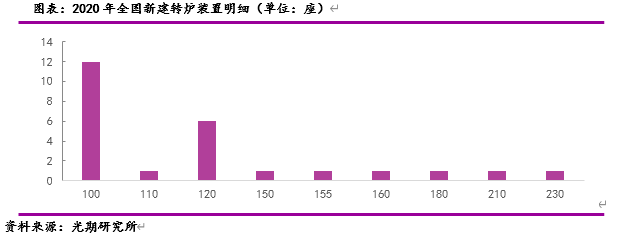 2020年拟新建转炉25座,转炉容量从100吨到230吨不等,产能达到6145万吨,新建100吨转炉最多,高达12座,其次为120吨转炉,这两种规模的转炉占全部新建转炉数量的70%以上,具体转炉装置投产明细如下: